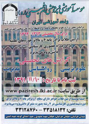 این اطلاعیه حاکی است: طلاب علاقه مند می توانند تا تاریخ 10/11/91 از طریق سایت Paziresh.iki.ac.ir ثبت نام نمایند.در پایان گفتنی است موسسه آموزشی و پژوهشی امام خمینی (ره) در سال 1372 با هدایتها و حمایتهای مقام معظم رهبری حضرت آیتالله خامنهای (حفظهالله تعالی) و به ریاست آیتالله مصباح یزدی با مجوز وزارت علوم تحقیقات و فناوری، در راستای تبیین مبانی اندیشههای دینی در علوم انسانی تأسیس شد.